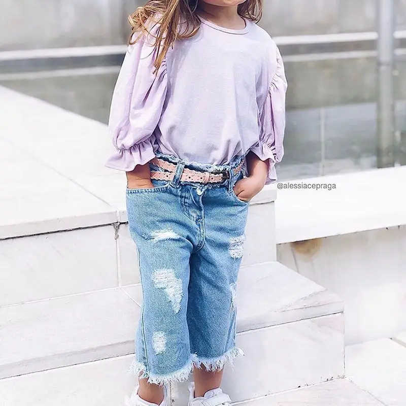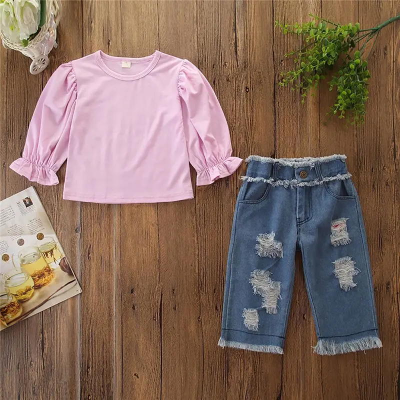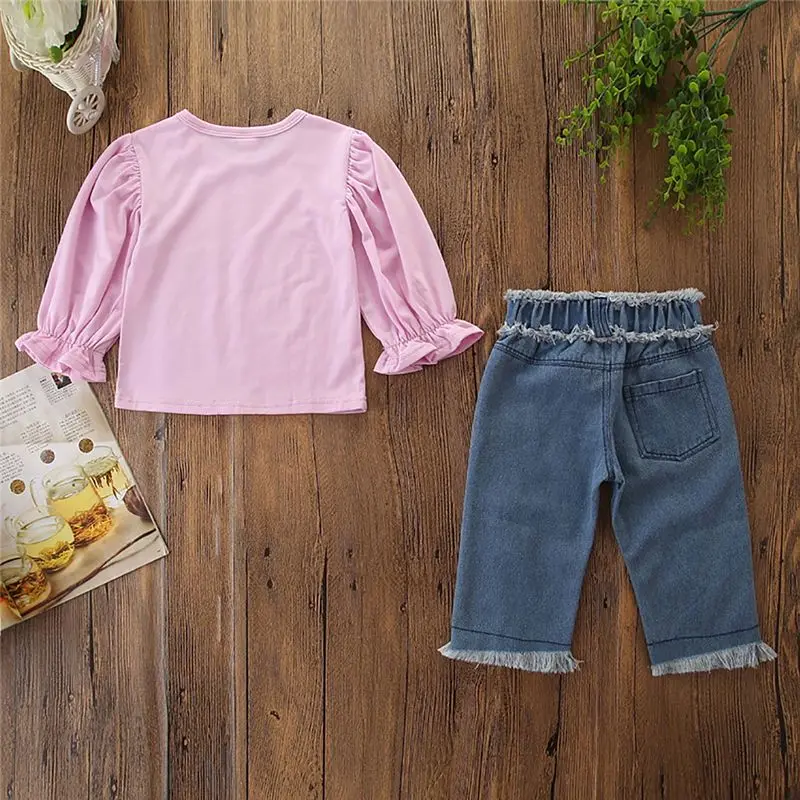 Special Price for 1-6Y Autumn Toddler Kids Baby Girls Clothes Sets Pink Tops T-shirt Denim Long Pants Hole Jeans 2Pcs